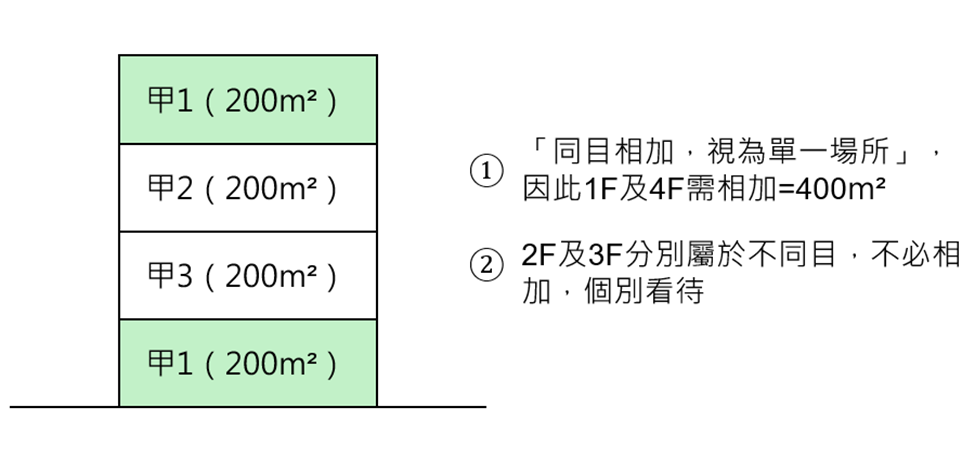因此,重點在於「以各目為單元,按各目合計樓地板面積,視為單一場所」。